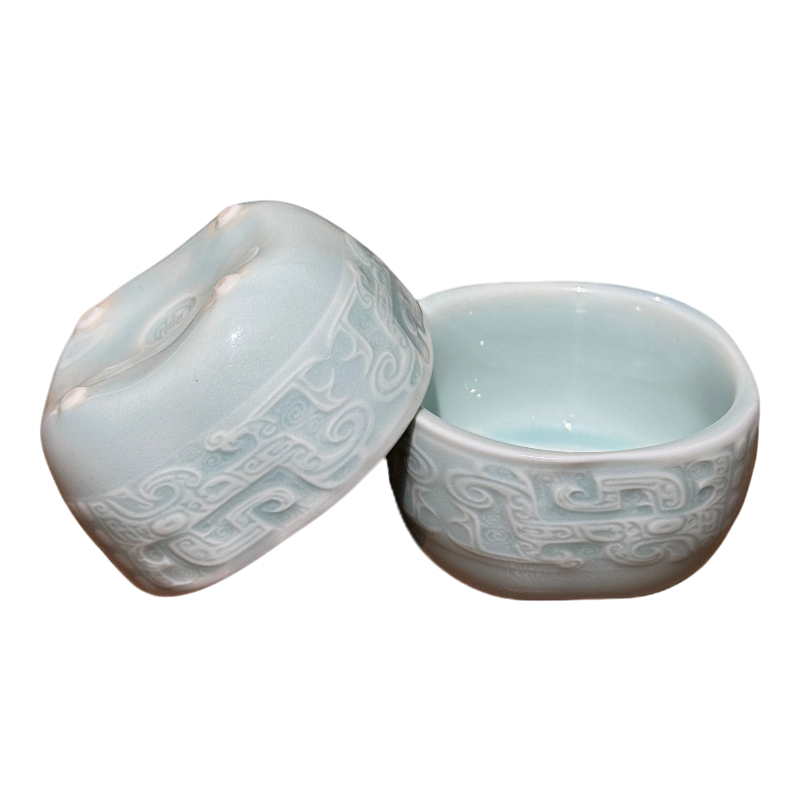 耀州窑青铜纹青瓷浮雕小方杯45ml *2个