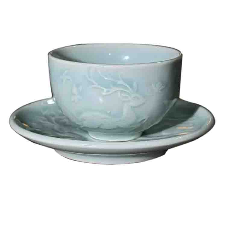 宋品天耀耀州窑天青釉瑞鹿杯80cc口径8*高度5cm+杯托 *1套
