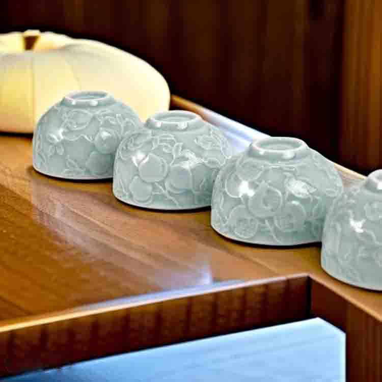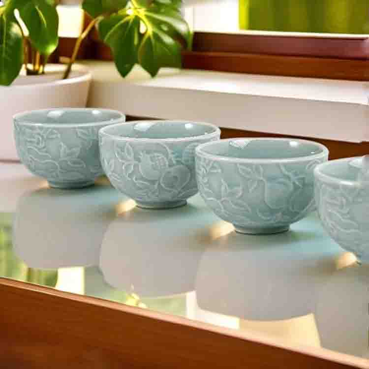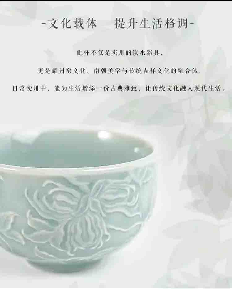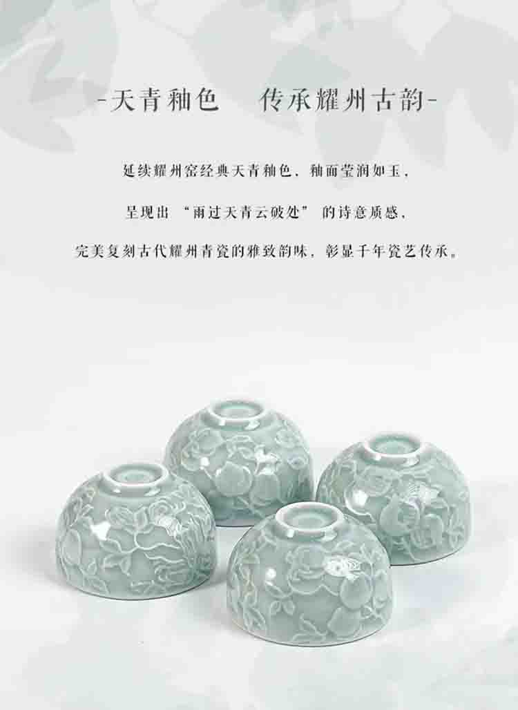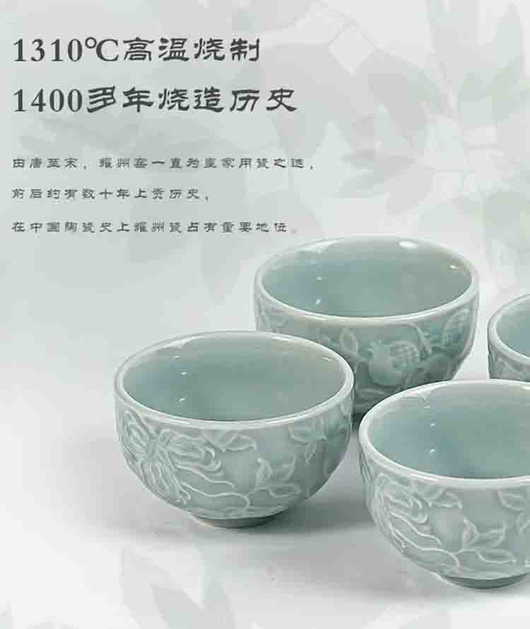 耀州窑宋品天耀青瓷为原矿釉高温瓷,经过1310℃到1330℃高温烧制,瓷化程度高,烧制工艺讲究,以刻花为代表,釉下刻花,剔花为精准,独有的湿刻工艺,其技术传承至今