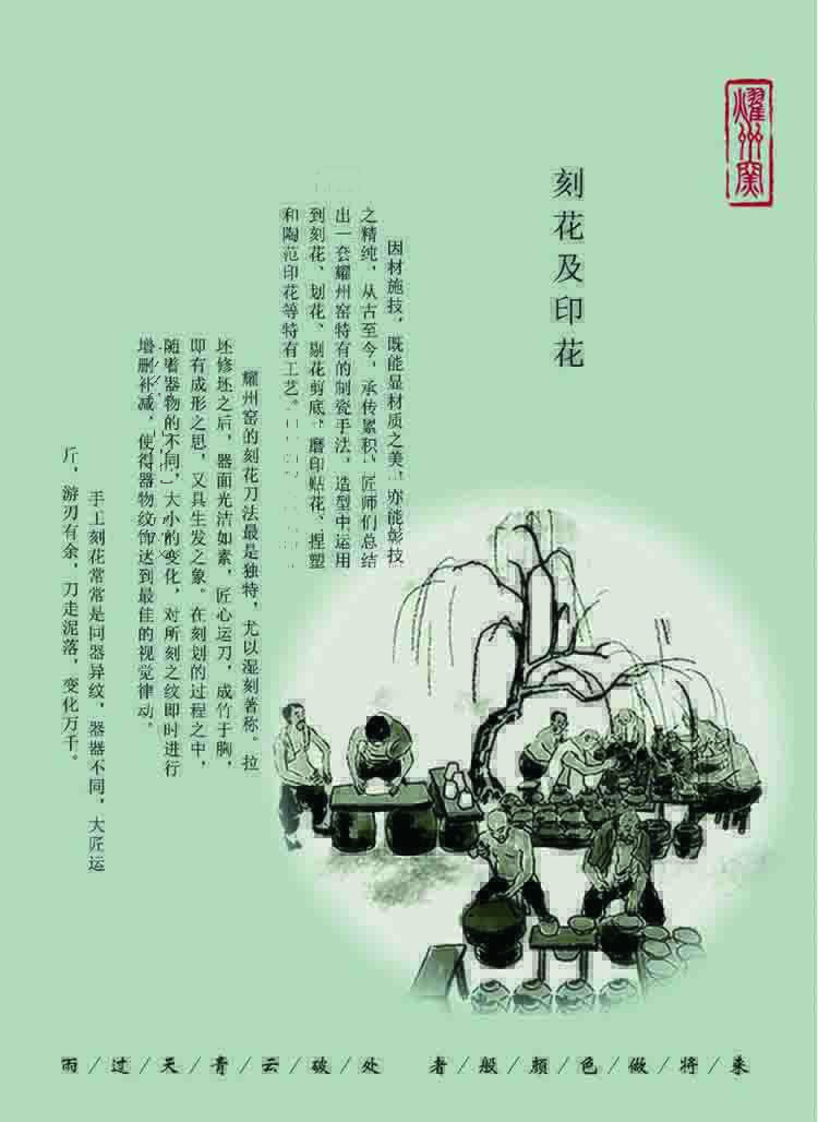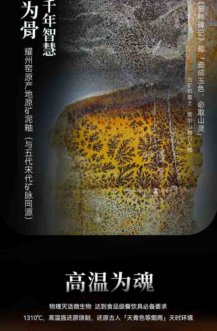 耀州窑宋品天耀青瓷为原矿釉高温瓷,经过1310℃到1330℃高温烧制,瓷化程度高,烧制工艺讲究,以刻花为代表,釉下刻花,剔花为精准,独有的湿刻工艺,其技术传承至今