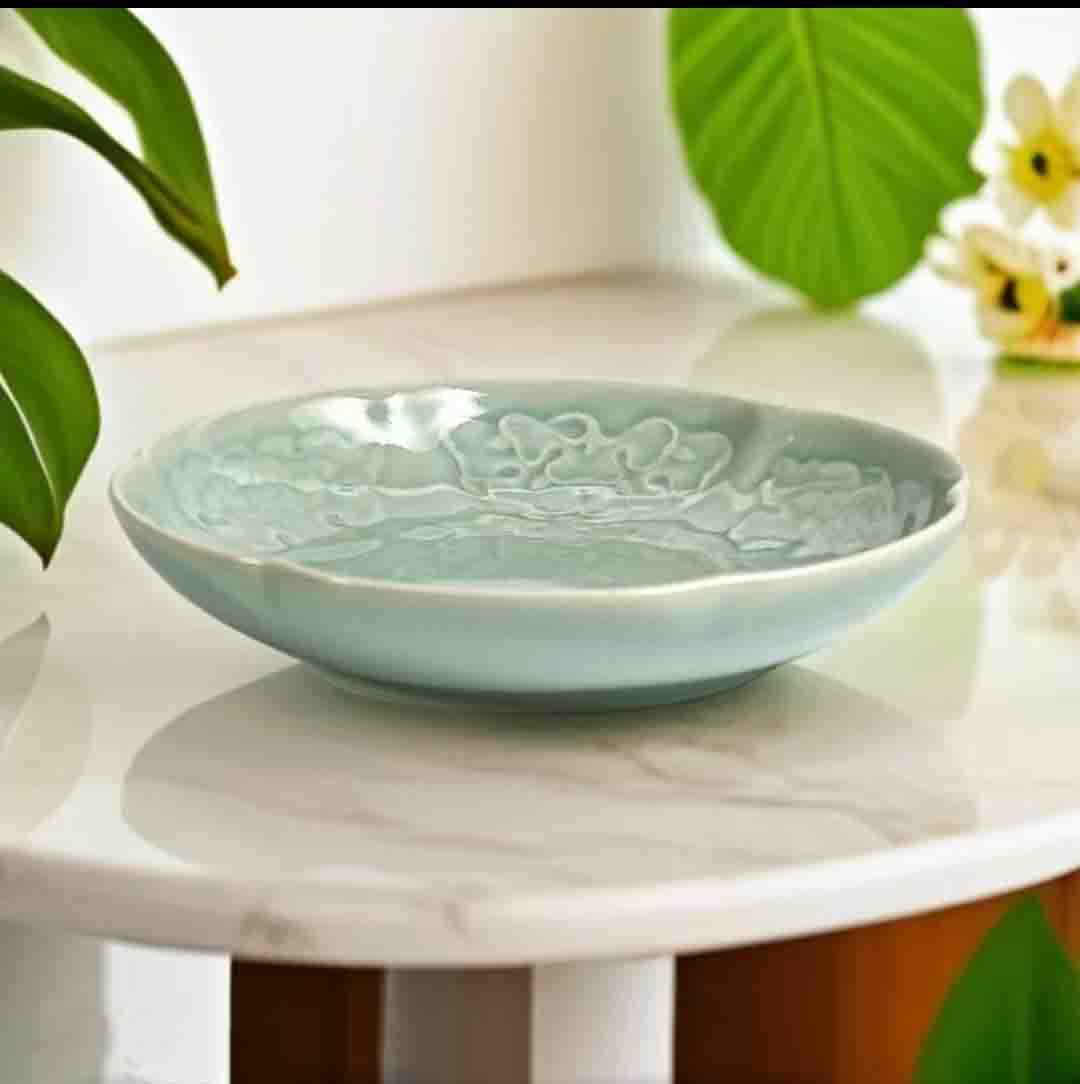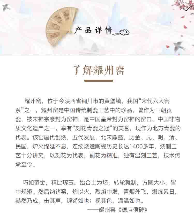 耀州窑宋品天耀青瓷为原矿釉高温瓷,经过1310℃到1330℃高温烧制,瓷化程度高,烧制工艺讲究,以刻花为代表,釉下刻花,剔花为精准,独有的湿刻工艺,其技术传承至今