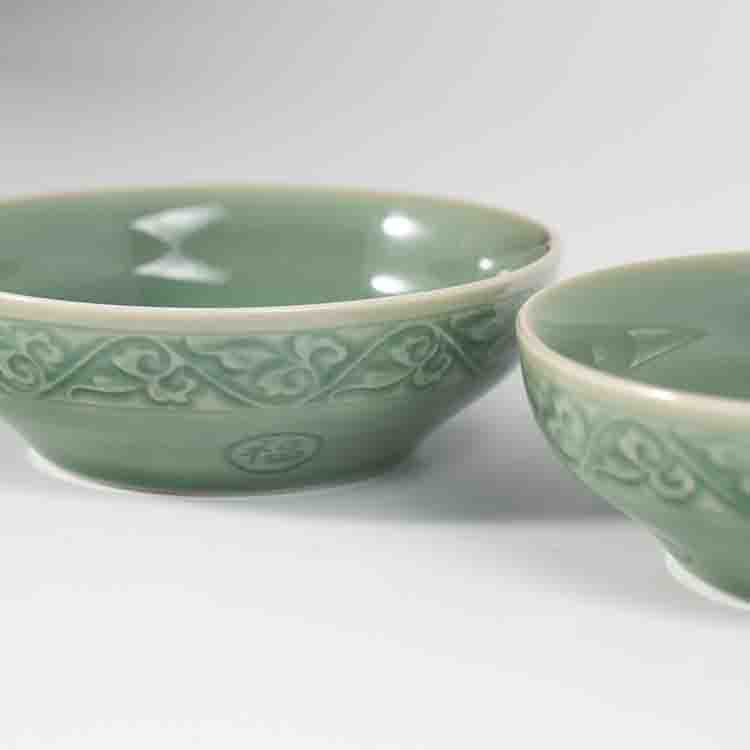耀州窑宋品天耀青瓷为原矿釉高温瓷,经过1310℃到1330℃高温烧制,瓷化程度高,烧制工艺讲究,以刻花为代表,釉下刻花,剔花为精准,独有的湿刻工艺,其技术传承至今。